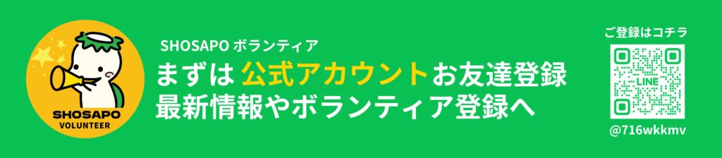 まずはSHOSAPOボランティアグループ【公式LINE】に登録し、「顔合わせ登録会」の予約をお願いします相談や質問なども、お気軽にご連絡ください ▶️ https://lin.ee/Q0dTrb4 もちろん、ボランティア登録を迷っている方も、ご参加ください。